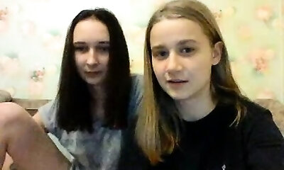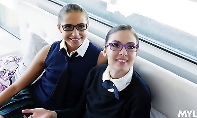Two splendid teen lesbian friends fucking each other with a huge strap-on dildo